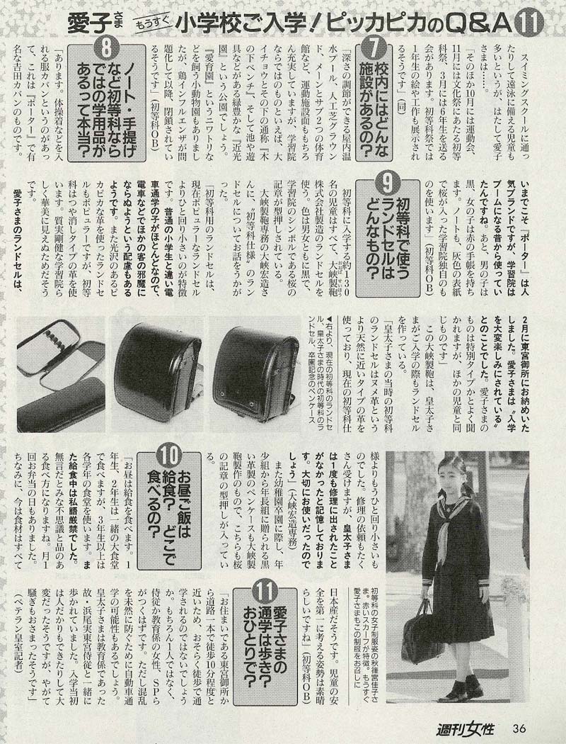 初等科で使うランドセルはどんなもの? 初等科に入学する約130名の児童はすべて、大峡製鞄株式会社製造のランドセルを使う。色は男女ともに黒で、学習院のシンボルである桜の記章が型押しされている。