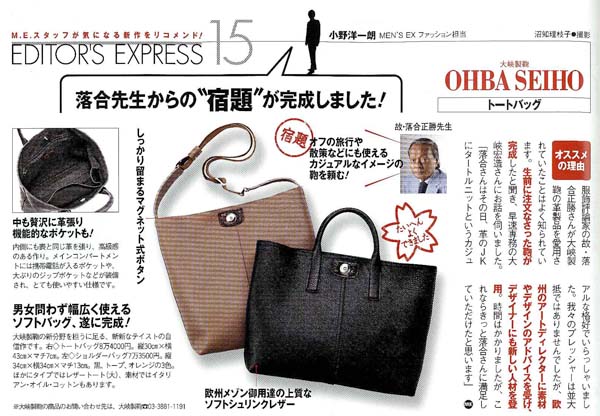 M.E.スタッフが気になる新作をリコメンド! 落合先生からの“宿題”が完成しました! 男女問わず幅広く使えるソフトバッグ、遂に完成! 【1164】ビジネス・トート 【1165】レザーショルダー 【1163】レザートート(大)