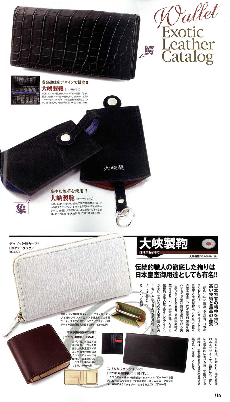 魅せるレザーを紹介する ・カジュアル・クロコダイル 【1108-3】長束入れ−通しマチ付き ・サファリ・エレファント 【1096-ELP】サファリ-キーケース 【1045】ポケットブック 【965-C】コードバン札入小銭付 【1119-ITL】ベビーカーフ束入れ