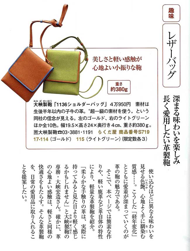 ・鞄は軽いに限る ・深まる味わいを楽しみ長く愛用したい革製鞄 普段使う鞄は身体への負担が少なく、軽いものを選びたい。 軽さに加え、機能性と使い勝手の良さを追求しデザイン性にも優れた、長く愛用できる鞄として紹介されました。 【1136】ショルダーバッグ