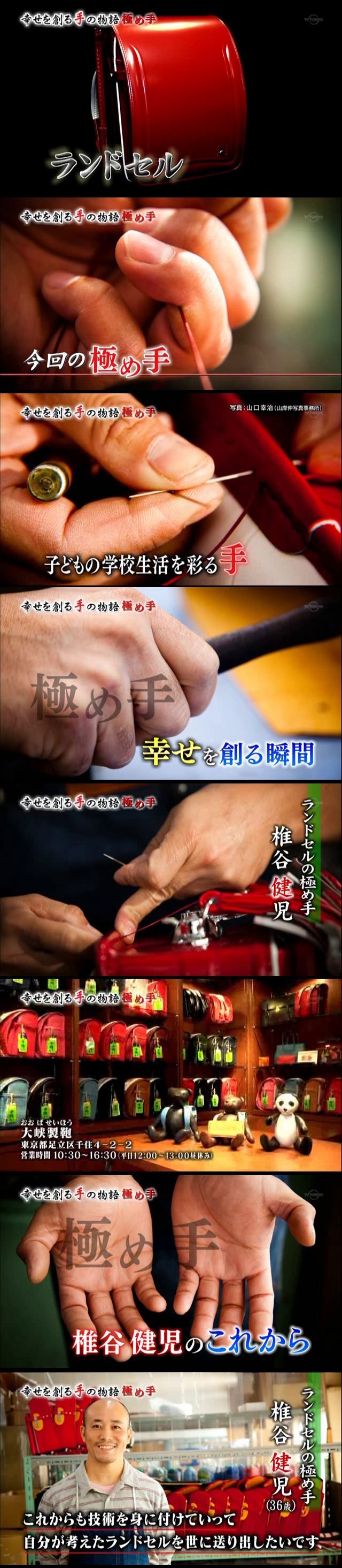 あなたは誰かを幸せにしていますか?自分では気がつかなくても人は人を幸せにしている。人は手で物を創る時、想いを込めその想いが人を幸せにする。そんな物語です。 手縫い職人の「手」は独特なものが有ります。そこへ焦点を合わせたのがテレビ東京のドキュメンタリープロデューサー。カメラマンやスタッフも気合が入り迫真の画像となりました。