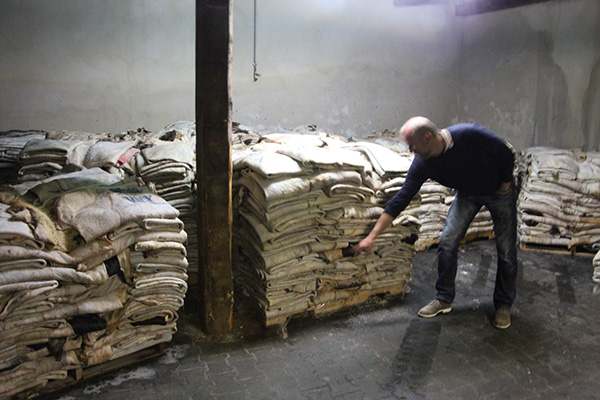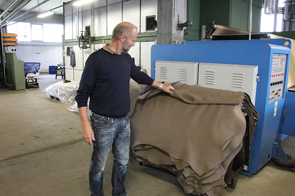 「今のところ、この原皮が最高だな。」指差すタンナー社長。
